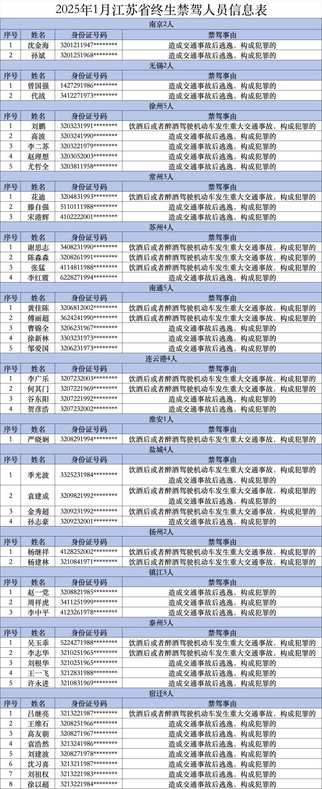 为负重致远防风险除隐患、保安全保通顺,发奋以高水祥瑞全保险高质料发展。本年以来,江苏交警抓续开展“五大曝光”活动,加大对严重交通犯行恶法活动的曝光力度,充分发扬教师疏导、警示震慑作用。据统计,2025年1月,全省计较48东谈主被照章破除灵活车驾驶证,且终身不得从头申领。现将名单赐与曝光。